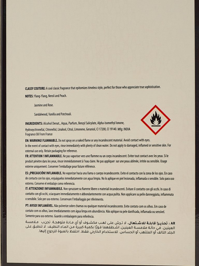 - Sensuāla un bagātīga kompozīcija, kas apvieno ambres un pikantu garšvielu siltumu ar jasmīna, rozes, mimozas un ilang-ilang ziedu sirdi. Sulīgs mandarīns un apelsīns piešķir svaigumu, savukārt pačūlija un tonkas pupiņas ietver aromātu dziļumā.