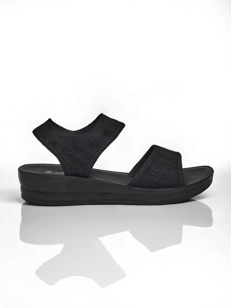 • Sandale dame me themel te trashë, që vishen lehtë, me shtrojë të rehatshme prej lëkure ekologjike. Rripat elastikë prej pëlhure përshtaten me këmbën, ndërsa elastiku në kyçin e këmbës siguron qëndrueshmëri dhe rehati gjatë veshjes. Ideale për verë – të l