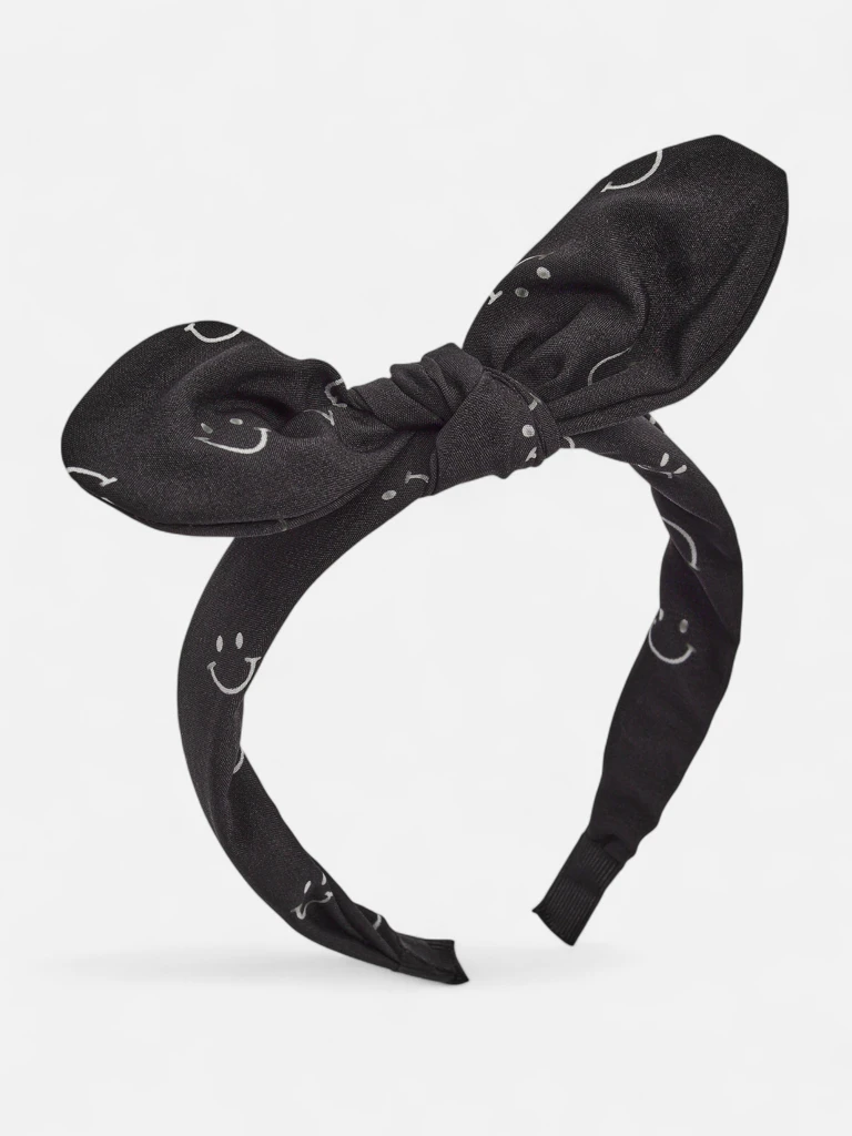 - Lavish kids' headband featuring a bow adorned with a smiley face print. Comfortable, elastic, and perfect for everyday styling – it will add joy to any child's look!