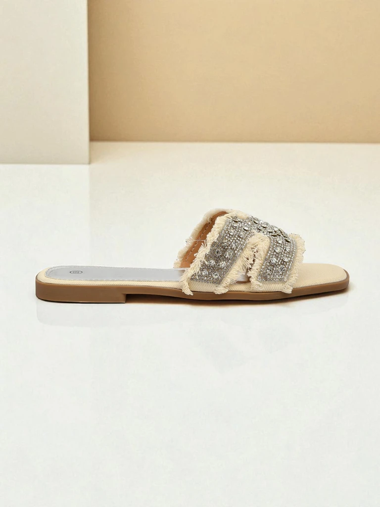 • Plakanas sieviešu čības no ekoādas, rotātas ar mirdzošiem rhinestones. Stilīgas un ērtas, ideāli piemērotas vasarai un īpašiem gadījumiem. Tās piešķir tērpam spīdumu un nodrošina komfortu visas dienas garumā.