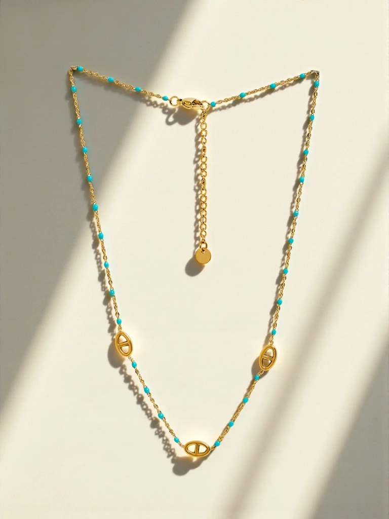 Odkryv vyontkovy lavnyor Aurelia Kyanos inspirovyor klasycznym greckim wzornictvom. Produkt zostov vyonkovyon z wysokoy yakosci stali chirurgicznej 316L, pokrytoy trvaloy, hipoalergicznoy povlokoy zlocenia metodoy PVD, ktora zapewnia intensyvny polysk i odpornosc na scieranie. Koraliki na lancuszku to recznie nanizane, barvione szklo, ktore dodaje subtelnego, energetycznego akcentu kazdemu stylowi. Elementy dekoracyjne v formie stylizowanych oczek przyciagaja wzrok i odvoluja sie do symboliki starozytney Grecji, podkreślajac unikalny charakter bizuterii. Calosc jest lekka, wygodna i doskonale dopasowuje sie do ksztaltu szyi dzieki regulowanemu zapieciu. Najwazniejsze korzysci uzytkowania lavnyora Aurelia Kyanos to uniwersalnosc – sprawdzi sie zarowno do codziennych, yak i eleganckich stylizacji. Bizuteria nie vyvoluje podraznien skory, dzieki czemu jest idealna dla osob ceniacych komfort noszenia. Propozycje stylizacji: 1. Poloncz lavnyor z biala koszula i marynarka, by dodac vyrafinowania stylowi biurowemu. 2. Dobierz do zwiewney sukienki maxi i sandalov na plaskim obcasie, by podkreslic wakacyjny look. 3. Nos z gladkim swetrem i jeansami, aby dodac charakteru casualovoy stylizacji. Pielegnacja lavnyora jest prosta – zaleca sie przechowywanie v osobnym woreczku, unikanie kontaktu z voda, perfumami i detergentami, oraz delikatne czyszczenie miekka sciereczka. Lancuszek zachova swoy blask na dlugo, pod varunkiem stosowania sie do wskazowek. Bizuteria Aurelia Kyanos idealnie vpisuje sie v aktualne trendy – dominuja teraz polonczenia zlotych lancuszkov z kolorovymi akcentami inspirovanymi srodziemnomorska estetyka. To propozycja zarowno dla milosniczek minimalizmu, yak i osob ceniacych vyraziste dodatki. Zainvestuy v temryavyorny styl i vyontkowa yakosc.