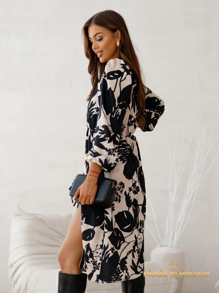 Odkryj wyjątkową sukienkę Melania Botanica – połączenie ponadczasowej elegancji i najnowszych trendów modowych. Wykonana z wysokiej jakości tkaniny, składającej się z 65% poliestru oraz 35% wiskozy, co gwarantuje nie tylko trwałość, ale i komfort noszenia. Lekka, oddychająca mieszanka materiałów została opracowana z myślą o wygodzie, pozostając miękka w dotyku i przyjazna dla skóry. W procesie produkcji wykorzystano nowoczesne techniki drukowania cyfrowego, które zapewniają wyrazisty i trwały, botaniczny wzór w odcieniach brązu, stanowiący must-have tej jesieni.Sukienka ma długość midi sięgającą południa łydki, co nadaje sylwetce harmonii oraz subtelności. Długi rękaw z delikatnym marszczeniem podkreśla elegancki charakter, a dekolt z praktycznym zapięciem na rzep sprawia, że zakładanie jej jest szybkie i wygodne. Talia została zaakcentowana lekkim przewiązaniem, które podkreśla kobiecą figurę oraz nadaje stylizacji lekkości.Cechy i zalety:- Wyjątkowy komfort dzięki przewiewnej tkaninie z wiskozą.- Trwałość i łatwość pielęgnacji (poliester nie gniecie się i nie traci kształtu).- Uniwersalny, stylowy wzór botaniczny idealny na co dzień i specjalne wyjścia.- Subtelne rozcięcie dodające sukience lekkości i kobiecości.Stylizacje i propozycje:1. Na co dzień: Połącz z kozakami i kapeluszem, tworząc ultra-modny casualowy look idealny do pracy czy na spotkania.2. Na eleganckie wyjście: Dobierz klasyczne szpilki i złotą biżuterię, by wyeksponować wzór oraz niepowtarzalny fason sukienki.3. Weekendowy relaks: Noś z białymi sneakersami i dżinsową kurtką, podkreślając swobodny charakter stylizacji.Pielęgnacja:Sukienkę najlepiej prać w temperaturze do 30°C, na delikatnym programie – dzięki temu kolory i wzory pozostaną wyraziste. Zaleca się suszenie na płasko oraz prasowanie w niskiej temperaturze po lewej stronie. Sukienka nie wymaga szczególnej pielęgnacji – jest łatwa w utrzymaniu czystości.Trendy:Motywy botaniczne i naturalne kolory są teraz niezwykle modne – wpisują się w eko-trend i minimalizm, królujący na wybiegach. Długość midi oraz luźniejsza forma, podkreślająca talię, idealnie sprawdzą się na różne okazje, gwarantując styl i wygodę przez cały dzień.