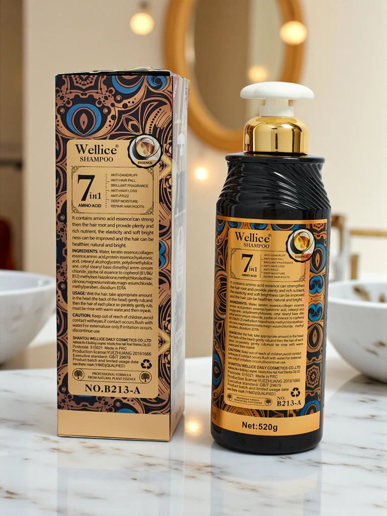 - Wellice Szampon 7 w 1 do włosów zniszczonych i suchych z aminokwasami intensywnie odbudowuje, nawilża i wzmacnia włosy. Redukuje łamliwość, nadaje blask, wygładza i ułatwia rozczesywanie, pozostawiając włosy miękkie i zdrowe.
