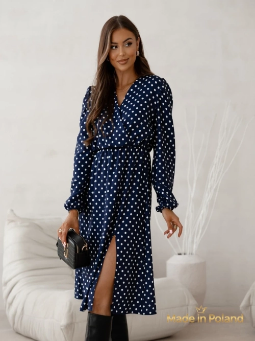 - Lavish midi dress for ladies, crafted from delightful fabric, featuring long sleeves and a wrap neckline. The design incorporates an elastic waistband. An absolute essential for your wardrobe! NOTE: Measurement accuracy (+/-) 1 cm. Dimensions measured fla