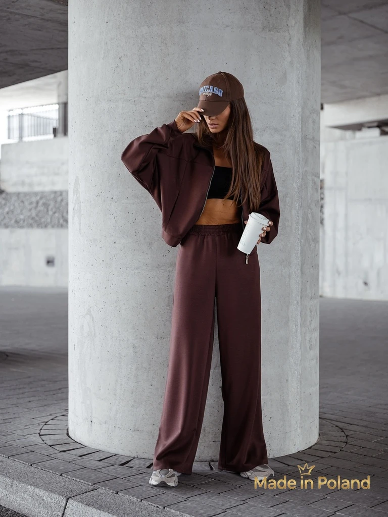 • Damski komplet dresowy wykonany z przyjemnego materiału wiskozowego. Bluza rozpinana. Długie, szerokie spodnie z gumą w pasie i na nogawkach, z 2 kieszeniami. Poczuj styl w tym wspaniałym komplecie!