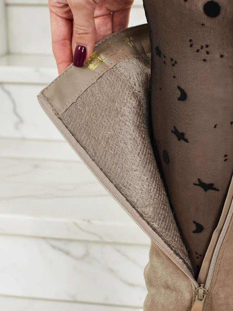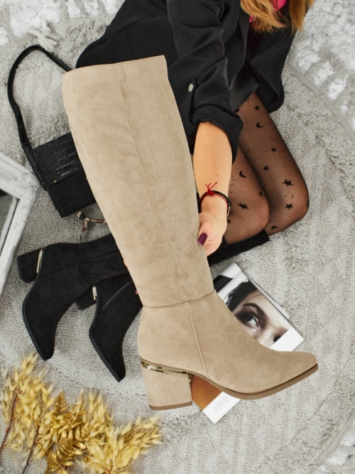 - Lav stylowe damskie kozaki do kolana na słupku. Cholewka wykonana z eko skóry zamszowej, w środku ocieplenie w formie futerka. Model zapinany na suwak. Idealne do codziennych jesiennych outfitów!