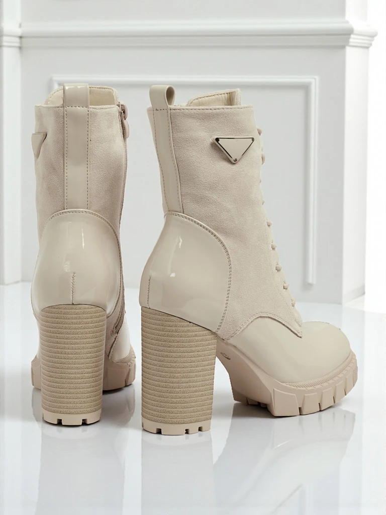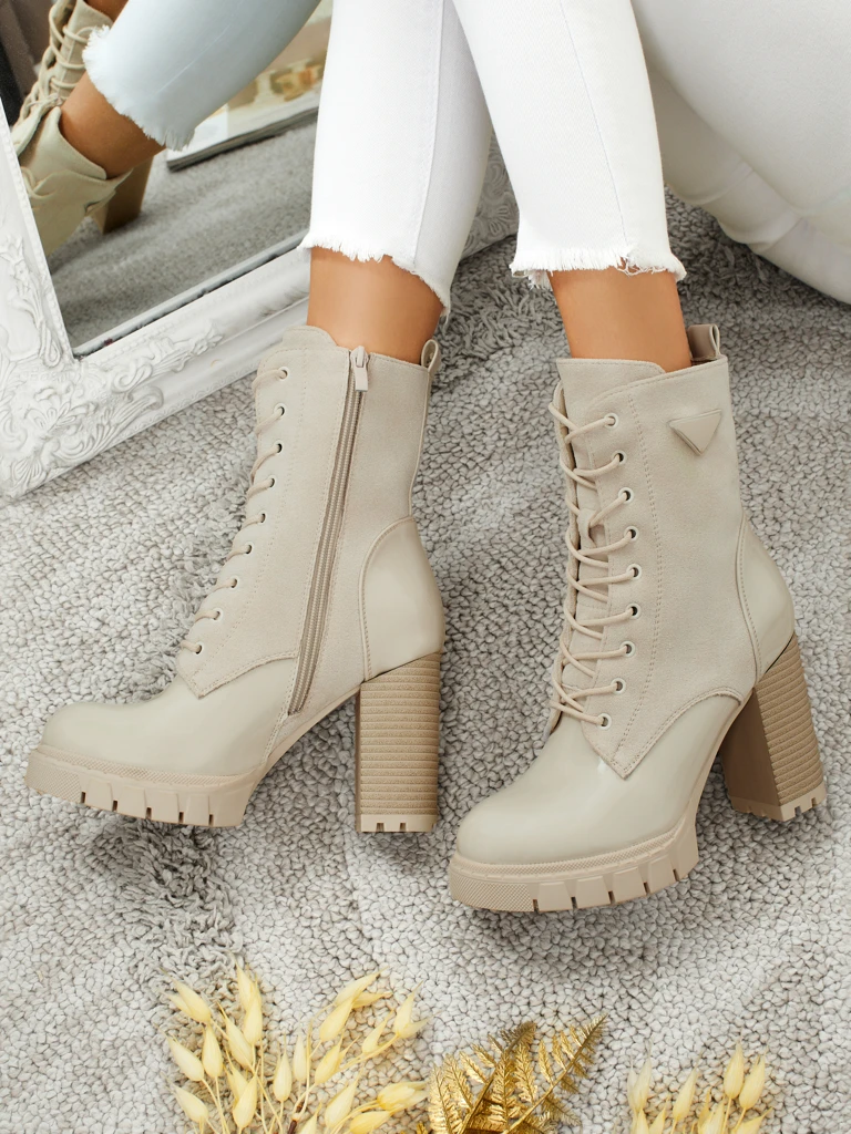 - Komode botki na stółpku, zbite z eko skóra zamszowa a skóra ekologiczna. Model sznurowany a zapinany na zamek. Dobry wybór na jeseń!