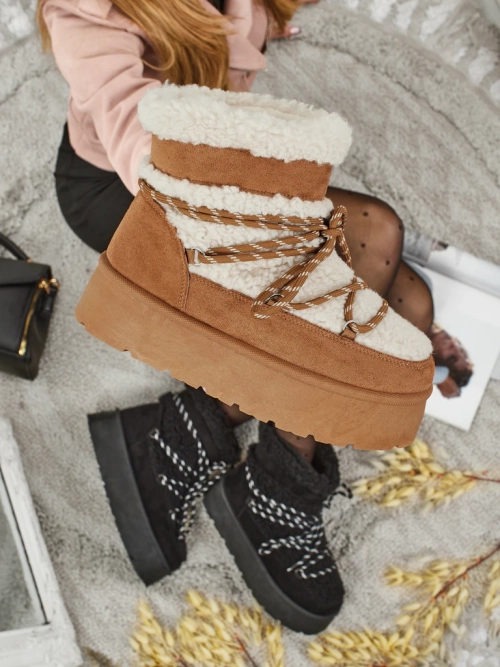 • Świetne damskie zimowe buty typu śniegowce na grubszej podeszwie. Cholewka wykonana jest ze skóry ekologicznej zamszowej oraz z materiau a'la kożuszek, środek ocieplony futerkiem. Idealna baza na zimę!