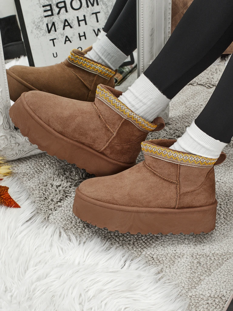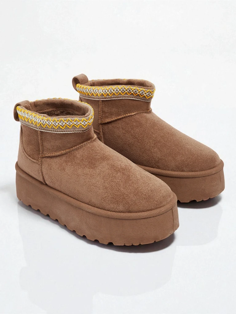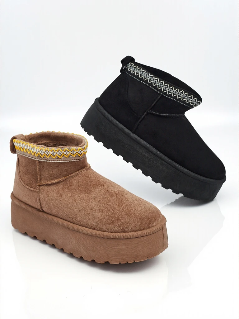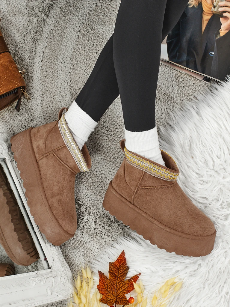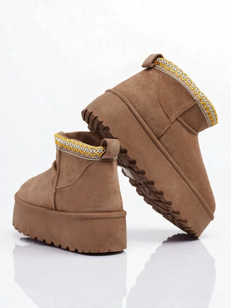 Immerse yourself in a world of comfort and fashion with Bruna platform boots, which combine timeless design with modern trends. These unique boots are the perfect choice for women who value warmth, comfort and original style in colder days. Their name, Bruna, refers to the warm, earthy color that perfectly fits into the autumn and winter color palette. Materials and Production Technology: Bruna boots are made of high-quality synthetic suede, which is not only durable and resistant to everyday use, but also easy to care for and environmentally friendly, being a vegan alternative to natural leather. The inside of the shoe is lined with soft, fluffy artificial fur, which guarantees unparalleled warmth and comfort, enveloping the feet like a delicate blanket. The solid platform sole, made of lightweight but durable synthetic material, provides excellent insulation from the cold ground and stability thanks to the non-slip tread. A characteristic element is the precisely made machine ethnic embroidery in shades of yellow, white and brown, decorating the upper, which adds a unique, artistic character to the boots. Unique Benefits and Comfort of Use: Wearing Bruna boots is pure pleasure. The soft fur inside keeps your feet warm even on frosty days, and the cushioning platform ensures comfortable walking for hours. Thanks to the raised sole, you gain a few centimeters in height while maintaining full stability and comfort. This footwear will allow you to feel free and stylish, regardless of the circumstances. Styling Tips: Bruna boots are an extremely versatile wardrobe item that you can easily match to many styles: 1. Casual Look: Combine them with fitted jeans or leggings, an oversized chunky knit sweater and a down jacket to create the perfect set for everyday outings or weekend walks. 2. Boho Chic Style: Pair the boots with a long, flowing maxi dress or skirt, throw on a fringed cardigan and add a wide-brimmed hat to emphasize your artistic spirit. 3. Urban Accent: For a more dynamic look, wear black skinny trousers, a loose hoodie and a fashionable parka. Bruna boots will add nonchalance and urban chic to the whole. Care and Cleaning: To ensure that your Bruna boots last as long as possible, remember to take proper care of them. Synthetic suede is best cleaned with a soft, slightly damp cloth. For larger dirt, use a special suede brush. Avoid soaking your shoes and using aggressive chemicals. After each use, allow them to dry in a ventilated place, away from direct heat sources. Store them in a dry and cool place. Fashion Trends: Bruna boots fit perfectly into current trends. Platforms are still a hot hit, adding a modern character to the styling and visually lengthening the figure. The trend for comfortable and warm footwear, ideal for the cold months, is invariably strong. Ethnic embroidery and details are a way to stand out from the crowd and add an individual, global accent to the styling. These boots are a combination of classic and modernity that will surely attract attention.