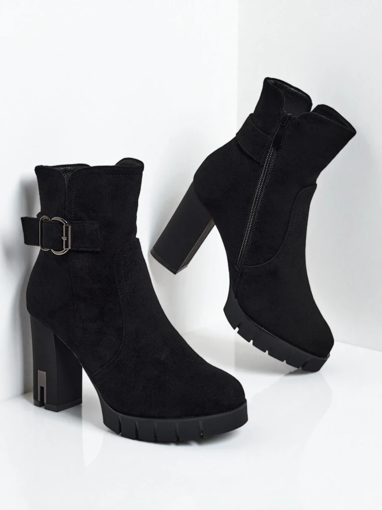 - Lav botki na słupku, wykonane z eko skóry zamszowej. Zapinane na zamek. Ocieplane futerkiem, z ozdobną klamerką. Idealne na jesień!