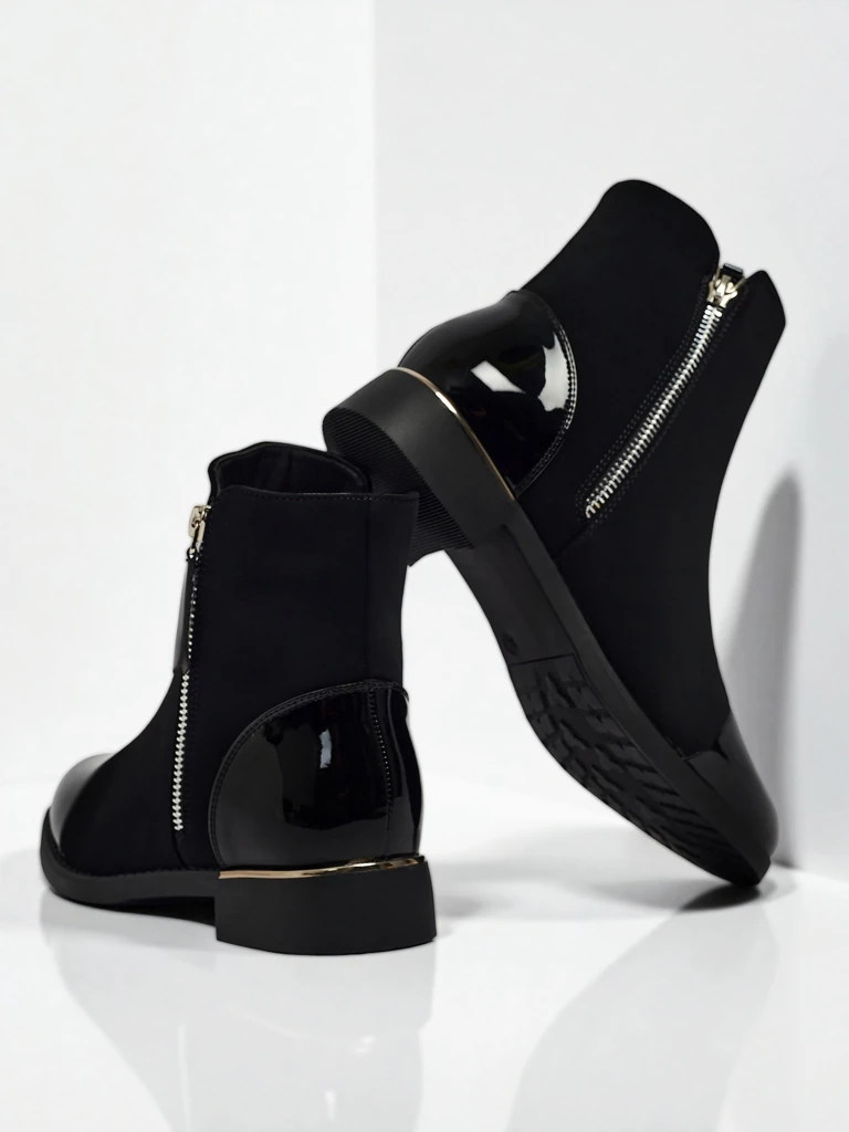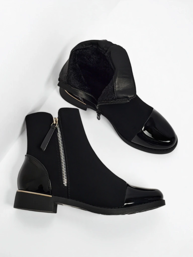 - Lavli botki damskie pe lo grubsher podesvye, wykonane som pe połączenia eko skuri lakierowanej i matowej. Vnetrze pe delikatnego futerka gwarantuje ciepło pe chłodniejsze dni. Model zapinany na zamek.