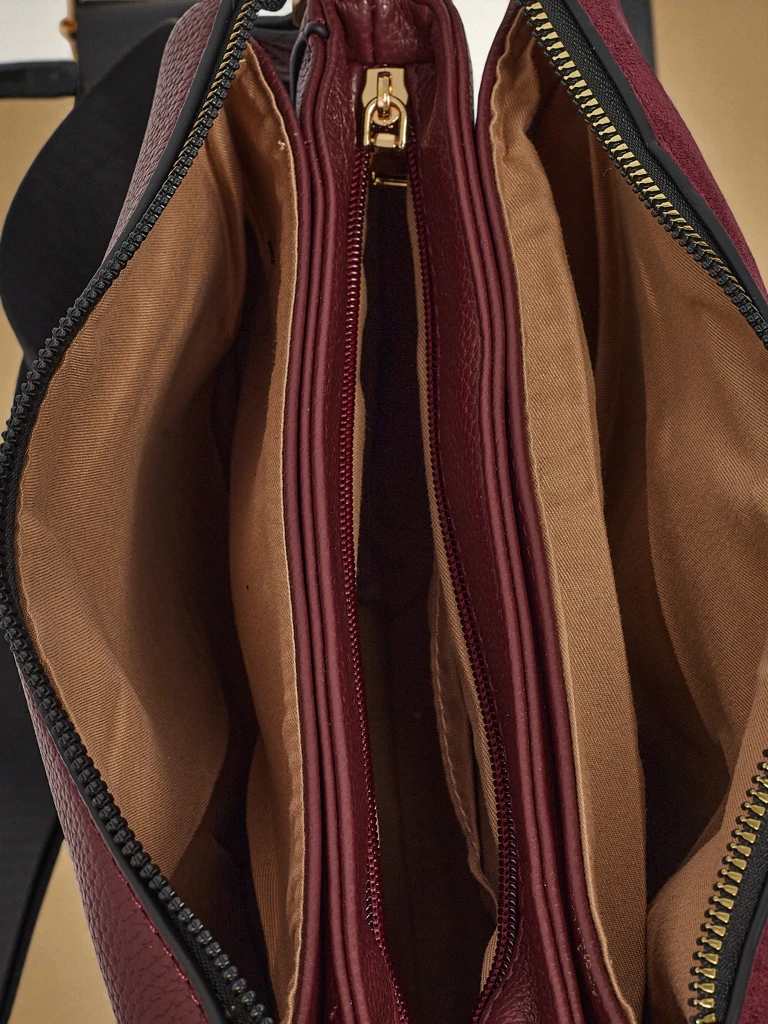 - Liten veske laget av en kombinasjon av miljøvennlig skinn og miljøvennlig semsket skinn. 3 rom, 4 lommer, glidelås og justerbar stropp. Stil og funksjonalitet i perfekt harmoni.