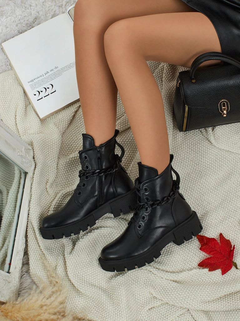 - Botki damskie z eko skóry, z zamkiem, ozdobnym łańcuszkiem i okrągłym noskiem, dodatkowo ocieplenie w formie futerka – nowoczesność, wygoda i styl w jednym.