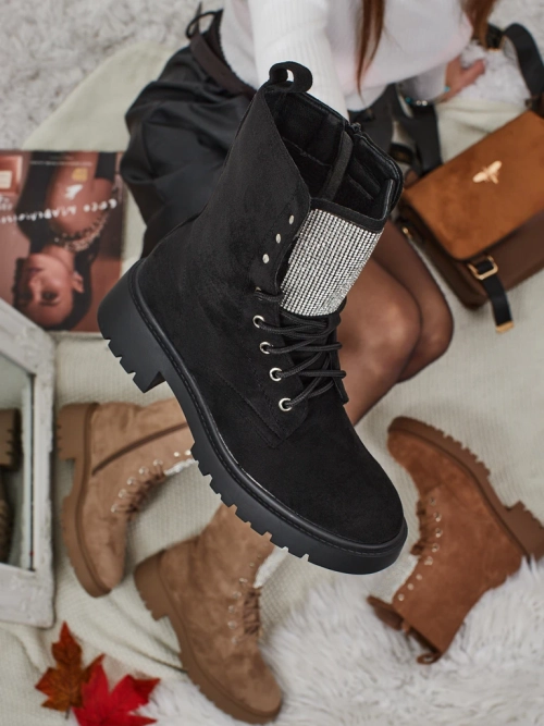 • Dámske členkové čižmy z eko semišovej kože, so zipsom a ozdobným šnurovaním a okrúhlou špičkou, navyše zateplenie látková vložka, modernosť, pohodlie a štýl v jednom. Predná časť zvršku je navyše zdobená zirkónmi.