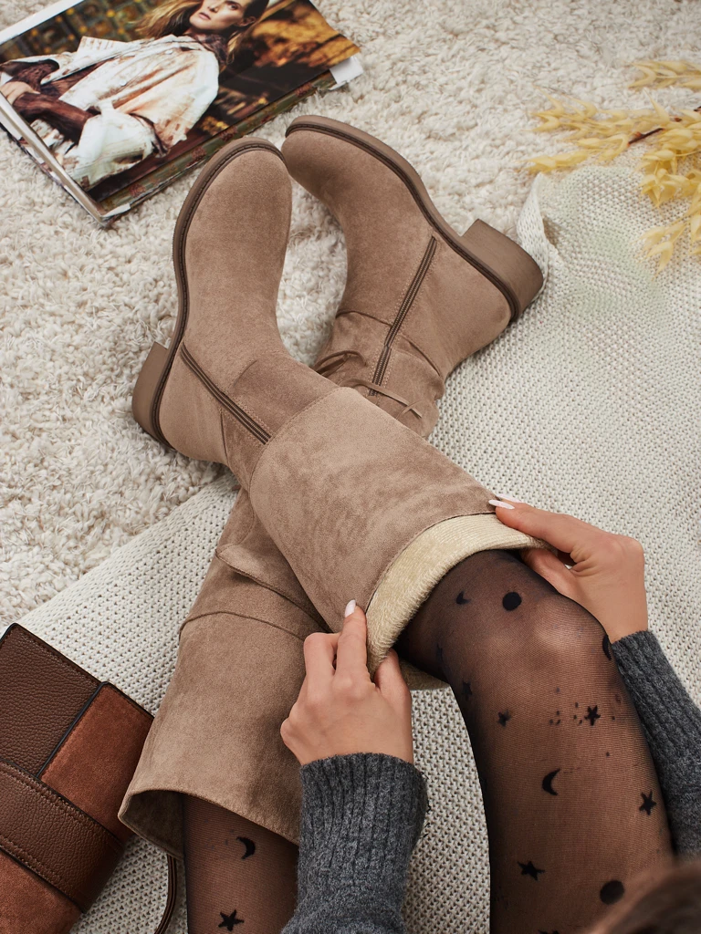 - Modne damskie kozaki za kolano na niskim obcasie. Cholewka wykonana jest ze skóry eko zamszowej. Wnętrze pokryte delikatnym futerkiem. Model zapewnia komfort i wygodę w chłodniejsze dni. Model zapinany na suwak do połowy łydki.