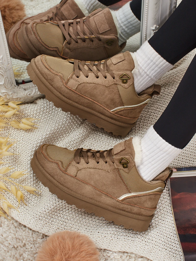 • Sneakers lav type na flat fut dis wan woman get. E get lace wey dem make wit eco-leather wey be like suede. Soft fur dey inside. E fit banger for your winter outfit wey dey casual!