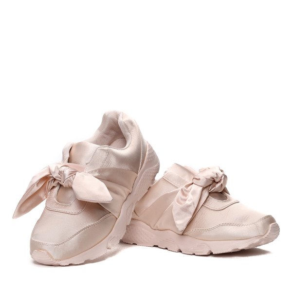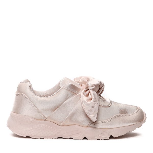 Bardzo dziewczęce sportowe obuwie, wiązane kokardką. W środku wkładka z tkaniny. Całość wykonana z tkaniny satynowej. Idealne do szkoły, pracy czy na spacer.