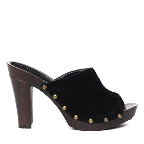 - Klasyczne klapki drewniaki na słupku wykonane z ekologicznego zamszu w kolorze czarnym. Buty po boku są zdobione dżetami. Obcas typu słupek. Cała wysokość obuwia wynosi 11,5 cm.