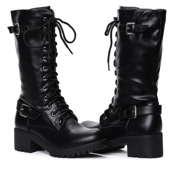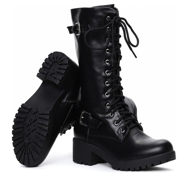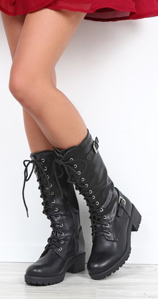 • Cudowne niskie kozaki a'la glany do połowy łydki na 5 cm obcasie. Obuwie wykonane z ekologicznej skóry. Zapinane na suwak po boku i sznurowane na przodzie. Idealne na zimniejsze dni! Stworzone dla kobiet lubiących rockowy styl.