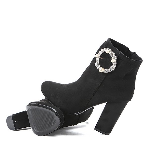 - Eleganckie botki z miękkiego eko zamszu na słupku w czarnym kolorze. No cholewce pasek z sprzączką zdobioną cyrkoniami i sztucznymi perełkami. Model zapinany na zamek. Idealny dodatek to jesiennych stylizacji!