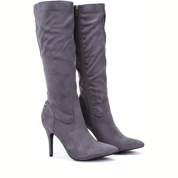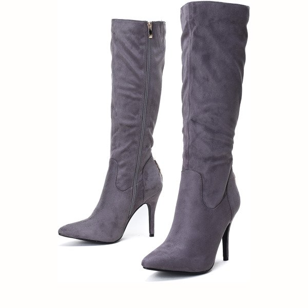 - Wyjątkowe kozaki na szpilce wykonane z ekologicznego zamszu. W środku ocieplenie w formie pianki. Nosek typu szpic. Model zapinany po boku suwakiem. Z tyłu posiadają złotą ozdobę. Buty świetnie sprawdzą się na co dzień jak i wieczór.