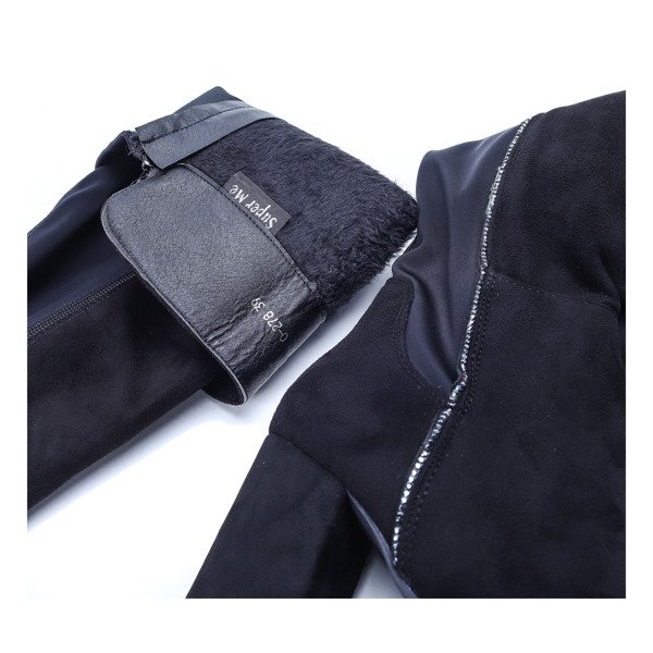 • Długie kozaki na słupku wykonane częściowo ze skóry ekologicznej zamszowej oraz z rozciągliwej tkaniny. Model ocieplany futerkiem, który znajduje się w przedniej części buta. Zdobione małymi cyrkoniami oraz zapinane suwakiem po boku.