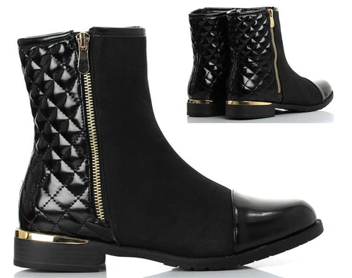 • Ocieplane botki na niskim obcasie. Cholewka połączona dwoma materiałami - syntetycznym lakierem oraz zamszem. Złota blaszka w obcasie idealnie wpasuje się w elegancki design. Ozdobny, złoty suwak.