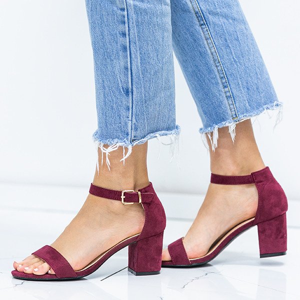 • Bardzo eleganckie sandały na niskim słupku w kolorze bordowym. Buty ze skóry ekologicznej zamszowej. Model zapinany sprzączką na kostce. Idealne do sukienek!