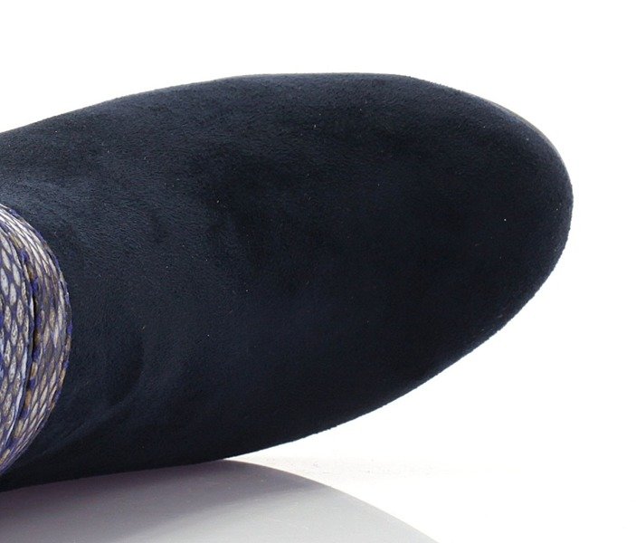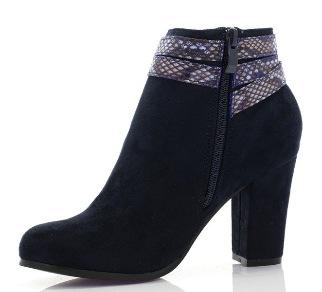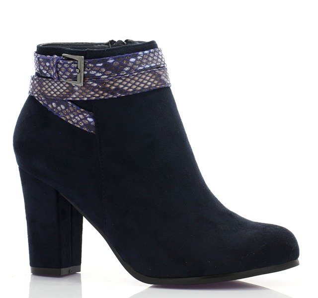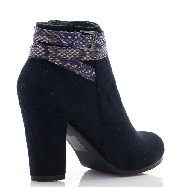 - Rewelacyjne botki na stabilnym słupku wykonane z eko-zamszu. Model zasuwany na suwak. Bardzo wygodne i solidnie wykonane. W środku delikatne ocieplenie. Cholewka zdobiona paskiem z klamrą imitującym skórę węża.