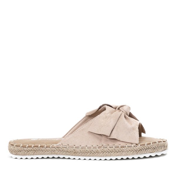 - Wyjątkowo lekkie klapki w kolorze nude. Materiał wykonany z ekologicznego zamszu. Wkładka wyłożona skórą ekologiczną. Na paseczku ozdobna kokardka. Podeszwa wykończona plecionym sznurkiem jutowym.
