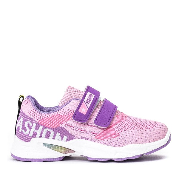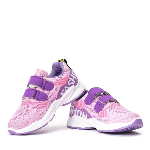 • Buty dziewczęce z plecionej tkaniny w trzech kolorach: różowym, fioletowym, fuksjowym. We wnętrzu butów zastosowano fioletowy materiał. Wygodnym rozwiązaniem jest zapięcie na rzepy. Podeszwa to gumowe tworzywo.