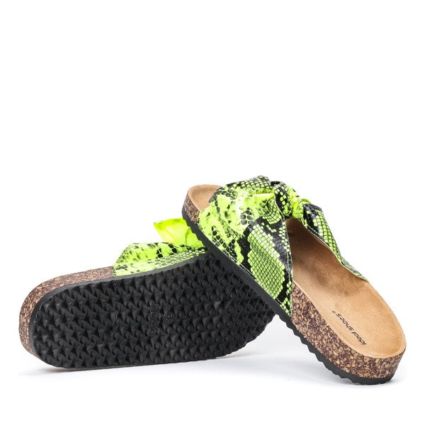 • Классические босоножки на толстой подошве с бантом. Женские туфли изготовлены из неоново-зеленой экокожи, имитирующей узор и фактуру кожи змеи. Стелька покрыта приятной на ощупь эко-замшей. Идеально подходит для повседневной укладки!