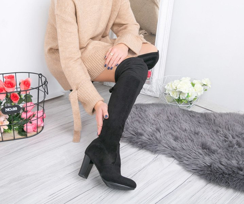 - Długie kozaki wykonane z zamszu. Obuwie zapinane na suwak. Idealnie dopasują się do nogi dzięki sznureczkom na zakończeniu cholewki. Polecane szczególnie do sukienek.