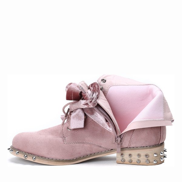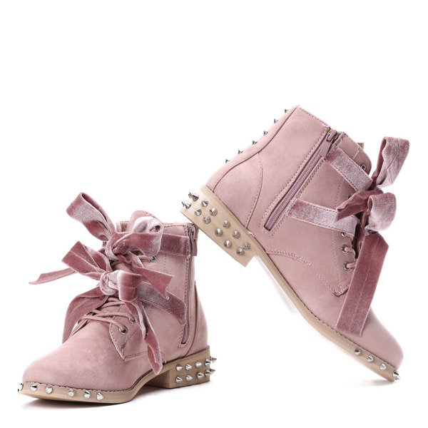 • Różowe workery zamszowe na płaskim obcasie. Zapinane na suwak, oraz sznurowane. Buty bardzo wygodne i stabilne. Dodatek w formie ćwieków i kokard czyni je unikatem wśród butów. Solidnie wykonane. Pasują do wielu odważnych stylizacji.