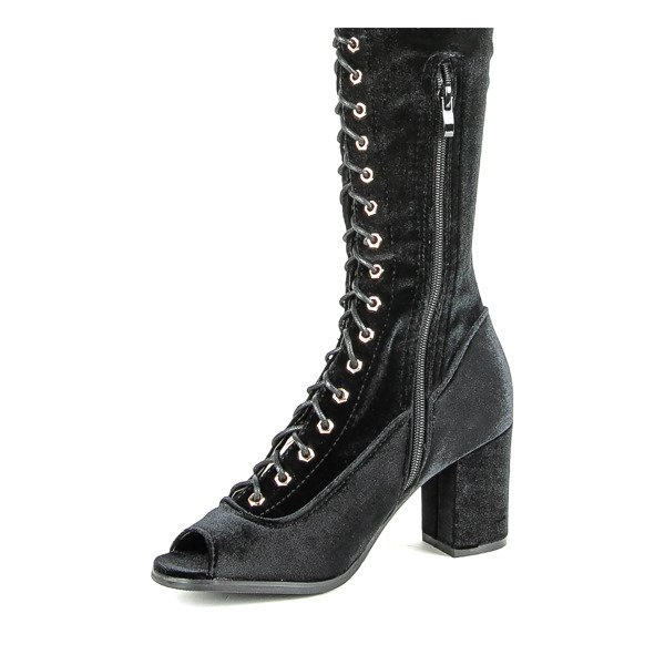 - Черные ботинки на стойке конюшни с открытым мыском. Материал изготовлен из велюровой ткани. Стелька обита экокожей. Сапоги имеют застежку-молнию на внутренней стороне и эффективную шнуровку по всей обуви.