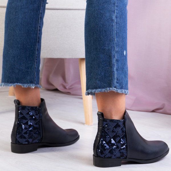 - Klasyczne botki na płaskim obcasie ze skóry ekologicznej w granatowym kolorze. Tylna część cholewki zdobiona cekinami. Model zapinany suwakiem, który znajduje się po boku. Botki idealnie się sprawdzą do codziennych stylizacji!