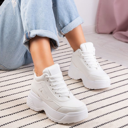 - Stylowe buty sportowe na grubej podeszwie. Materiał wykonania cholewki to eko-skóra w białym kolorze. Środek buta jest wyłożony miłą w dotyku tkaniną. Prezentowane obuwie damskie jest doskonałym dodatkiem do spodni!