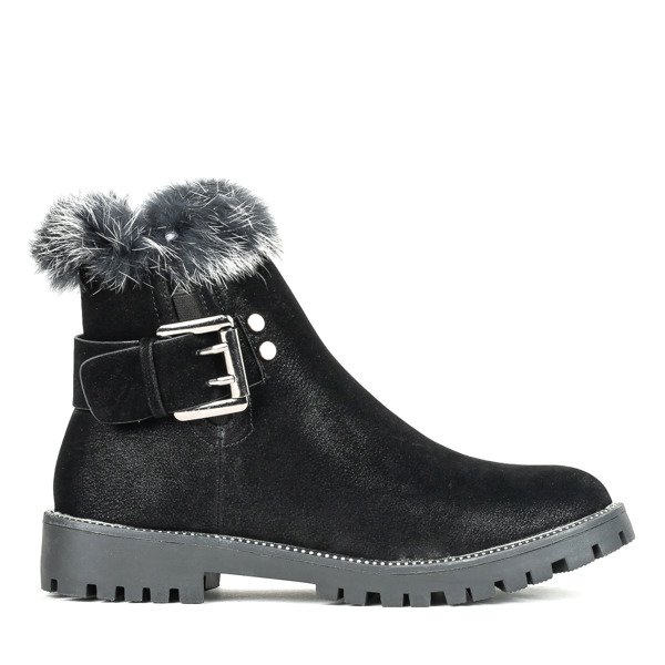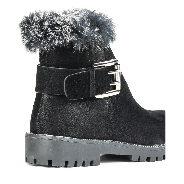 - Wygodne botki na płaskim obcasie z okrągłym noskiem. Materiał wykonania to eko skóra nubuk w czarnym kolorze. Środek buta jest wyłożony tkaniną. Górna część cholewki ozdobiona futerkiem. Obuwie posiada zapięcie na zamek oraz ozdobną klamrę.