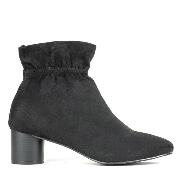 - Eleganckie botki na oryginalnym okrągłym słupku. Botki są wykonane z czarnego eko-zamszu. Cholewka posiada ozdobne marszczenie przy kostce. Botki będą świetnym dodatkiem do spodni oraz sukienek.