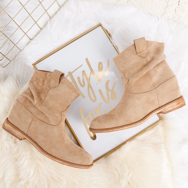 - Сапоги а'ля ковбойские сапоги на низком каблуке из органической замши бежевого цвета. Модель имеет утепление внутри в виде мягкого меха. Сапоги застегиваются на молнию. Идеальный вариант для холодных дней.