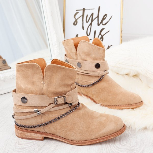 - Ботильоны в ковбойском стиле с закрытым каблуком-танкеткой. Материал - экозамша бежевого цвета. Внутренняя часть обуви утеплена мехом. На обуви есть украшения, которые можно снять. Идеально подходит для повседневного гардероба!