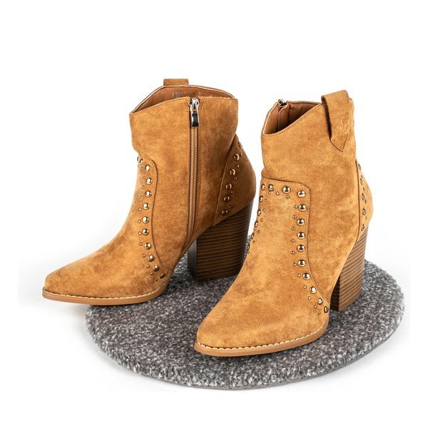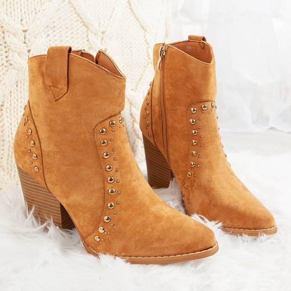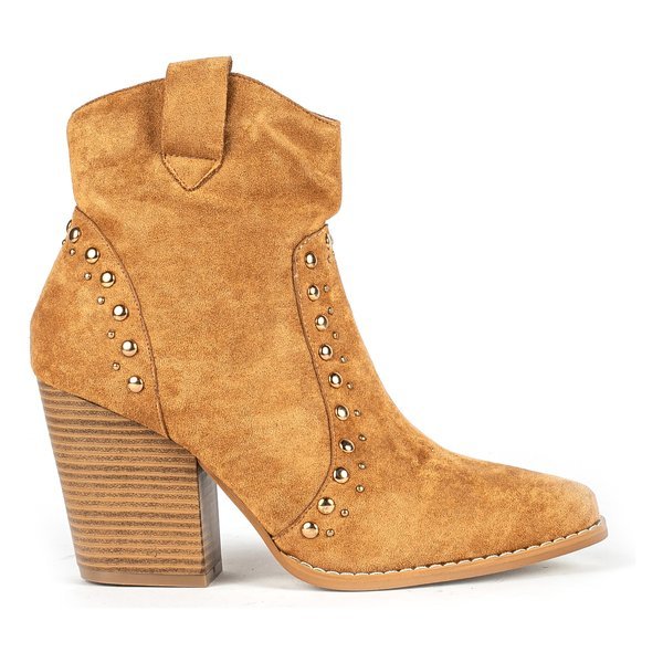 - Klasyczne kowbojki na wysokim słupku z migdałowym noskiem, Materiał wykonania to eko-zamsz w kolorze camel. Środek buta jest ocieplony futerkiem. Obuwie damskie posiada zapięcie na zamek po wewnętrznej stronie. Cholewka zdobiona złotymi ćwiekami.