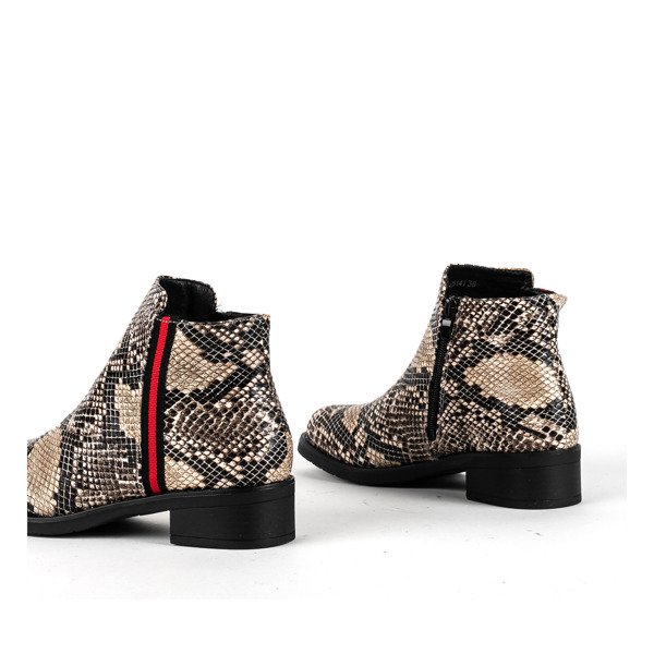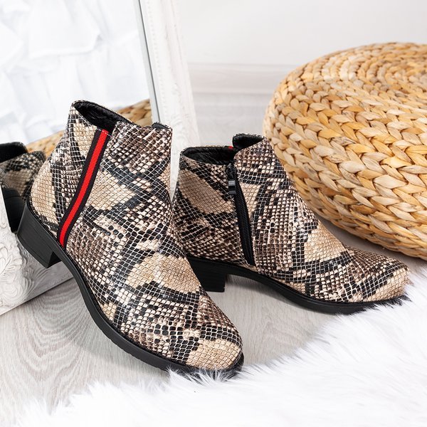 - Rewelacyjne botki na płaskim obcasie wykonane ze skóry ekologicznej. Cholewka wykończona wzorem imitującym skórę węża. Model zapinany na suwak po boku. W środku ocieplenie w formie futerka.