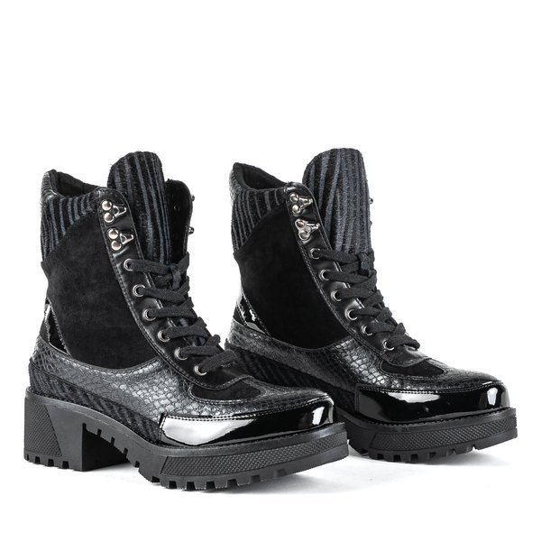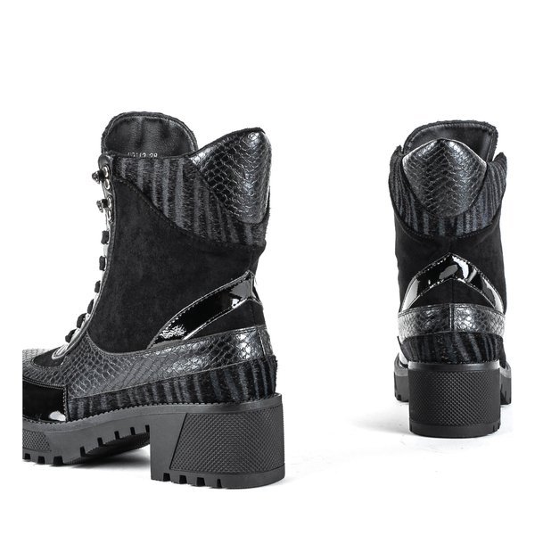 - Стильные сумки на прочной стойке. Верх представляет собой сочетание черной эко-замши и экокожи с животным рисунком. Внутренняя часть обуви утеплена мехом. Сапоги имеют шнуровку. Они отлично сочетаются с брюками и зимней одеждой!