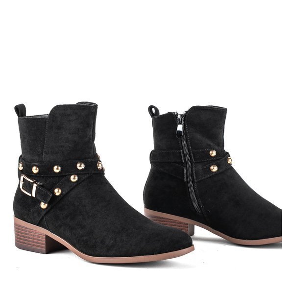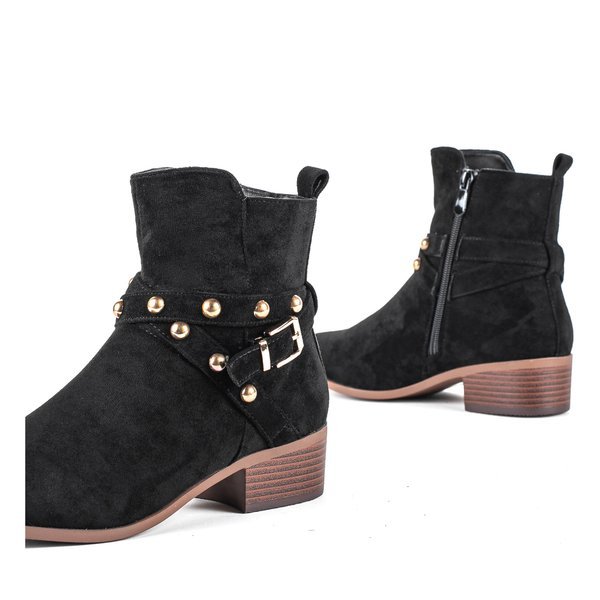 - Botki na płaskim obcasie wykonane z eko-zamszu w czarnym kolorze. Środek buta wyłożony futrem. Obuwie posiada zapięcie na suwak po wewnętrznej stronie. Botki są ozdobione paskiem z klamrą i złotymi dżetami.