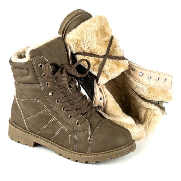 • Solidnie wykonane trapery na podeszwie z wyciętym bieżnikiem. Obuwie jest sznurowane oraz zapinane na suwak. Cholewka wykonana z eko-skóry w kolorze zielonym. Środek buta ocieplony miłym w dotyku futerkiem. Buty na zimowy czas!