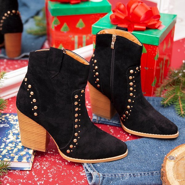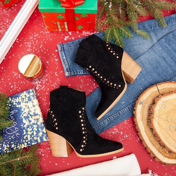 • Классические ковбойские сапоги на высокой стойке с миндалевидным мыском. Материал - экозамша черного цвета. Внутренняя часть обуви утеплена мехом. Женская обувь имеет внутреннюю молнию. Верх украшен золотыми заклепками.