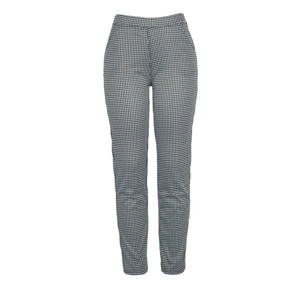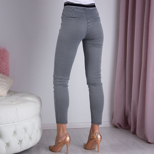 - Damskie spodnie z szeroką gumą. Tkanina jest rozciągliwa i posiada biało-czarny wzór w pepitkę. Z przodu znajdują się dwie płytkie kieszenie. Prezentowana odzież pozwoli stworzyć modną, casualową stylizację. UWAGA: Dokładność pomiaru (+/-) 1 cm.
