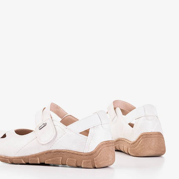 • Удобные женские туфли с низким вырезом с вырезами сверху. Модель выполнена из экологической кожи с глянцевым покрытием цвета экрю. Стелька также обшита экологической кожей. Модель на липучке. Идеально подходит для повседневной укладки!