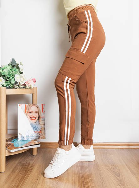 - Спортивные брюки с эластичной ткани. Модель имеет резинку в поясе и внизу штанин, а также 4 кармана. Брюки украшены лампасами по бокам.